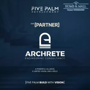 تتعاون شركة فايف بالم مع أفضل بيوت الخبرة المحلية والعالمية في مجالات التصميم المعماري والهندسة والإنشاءات والإدارة والتشغيل، فهذه الشراكات الاستراتيجية تضمن تقديم مشاريع مثل ديستريكت بالم مول العاصمة الادارية على أعلى مستوى من الجودة والاحترافية، مع الالتزام بالمواعيد.