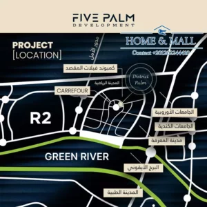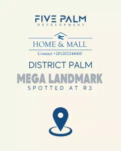 يجاور ديستريكت بالم مول شركة فايف بالم العقارية كمبوند فيلات المقصد الراقي، ويقع بجوار كارفور ماركت مباشرة، مما يضمن كثافة مرورية عالية وحركة تجارية نشطة، فهذا الموقع المتميز يزيد من القيمة الاستثمارية لوحدات ديستريكت بالم مول بشكل ملحوظ.