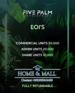 تعتبر وحدات ديستريكت بالم مول فرصة استثمار استثنائية، حيث يضمن المشروع عوائد مرتفعة بفضل موقعه الحيوي وإدارته المحترفة، ويحظى مشروع Five Palm Developments باهتمام كبير من المستثمرين لما يوفره من مزايا تنافسية وخدمات متكاملة على أعلى مستوى من الجودة.
