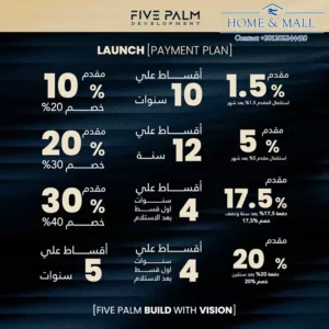 تقدم وحدات للبيع في مول ديستريكت بالم العاصمة الإدارية أنظمة حجز مرنة ومتنوعة تناسب مختلف القدرات المالية للمستثمرين، مما يسهل عملية الشراء والاستثمار، توفر شركة فايف بالم أنظمة سداد مختلفة في ديستريكت بالم مول، يمكن للعميل اختيار الأنسب.