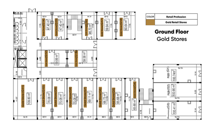 تتميز وحدات الطابق الأرضي في مول سيليستيا الشيخ زايد Celestia Sheikh Zayed بمساحات رحبة تبدأ من 47,40 وتصل الى 109,80 متر مربع، مع تصميم داخلي فاخر يليق بمكانة المحلات التجارية المتخصصة في الذهب والمجوهرات.