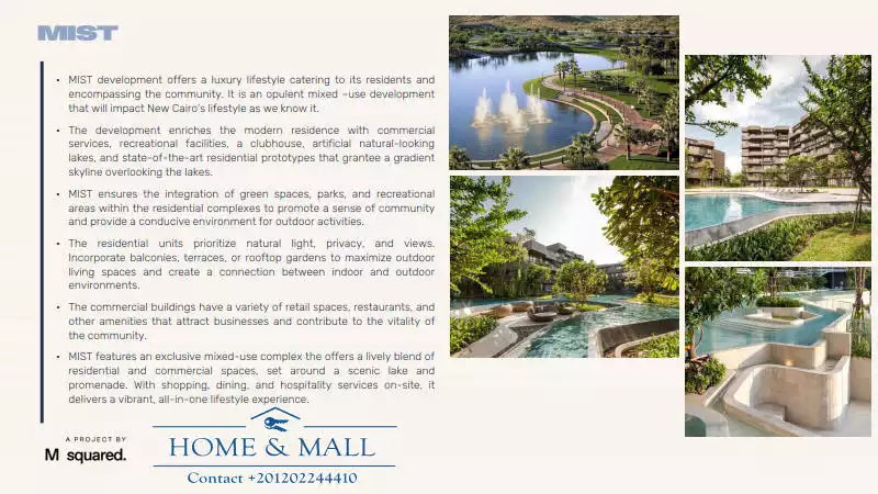 حرصت شركة ام سكوير للتطوير العقاري على أن تشغل الطبيعة المساحة الأكبر في Compound Mist M Squared، إذ تشغل المساحات الخضراء والبحيرات 80% من المشروع، مما يخلق بيئة تنبض بالهدوء وتقدم للسكان حياة مليئة بالسكون والجمال.